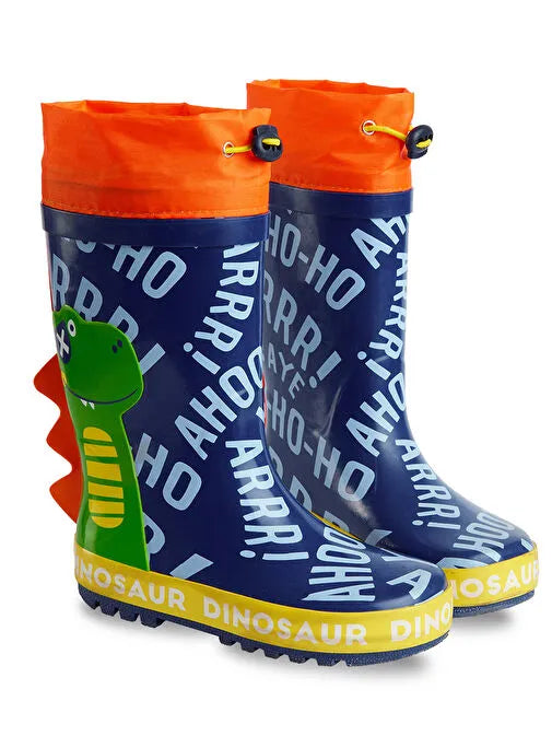 Su geçirmez, dinozor desenli erkek çocuk yağmur botu. Botun boğazındaki ayarlama lastiği sayesinde büzülerek bilekten içeri su geçmesini engeller.